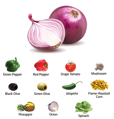 Our vegetables are picked farm fresh for Freshslice. Our tangy onions, vibrant green and red peppers to the perfect slice of mushroom. Pick from 11 options, even flame roasted corn!